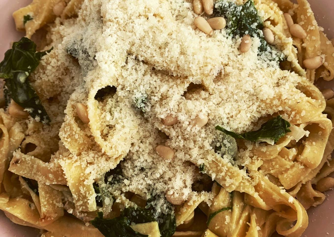 - Dresser dans une assiette creuse, parsemer le reste de parmesan sur le dessus avec quelques pignon de pain !