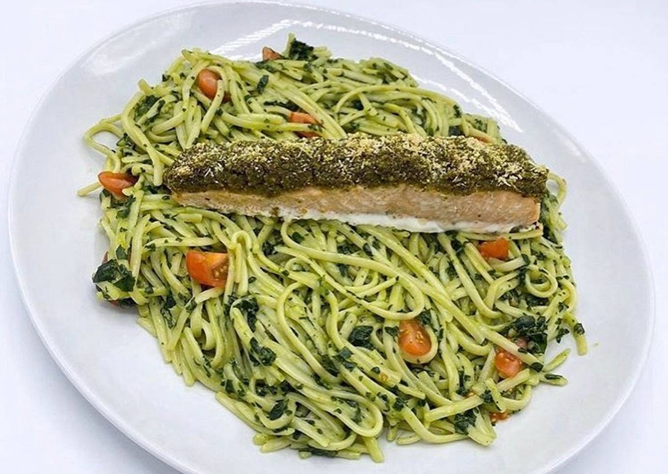 Pavé de Saumon en croûte de Pesto et ses Pâtes aux Épinards
