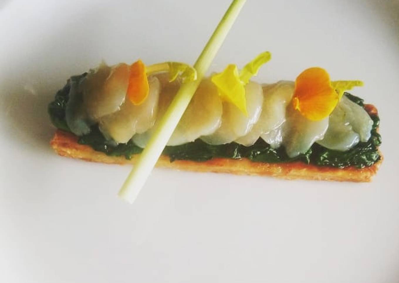 - Disposer sur une assiette de service le feuilleté mettre la tombé d épinards et le carpaccio de Saint_Jacques