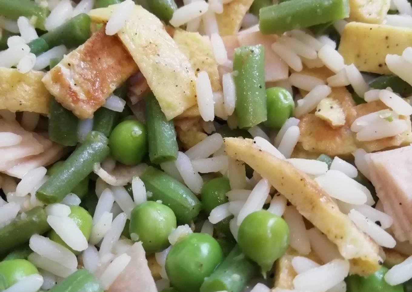 - Couper les haricots et les mettre de côté, ajouter les petits pois et le riz cuit