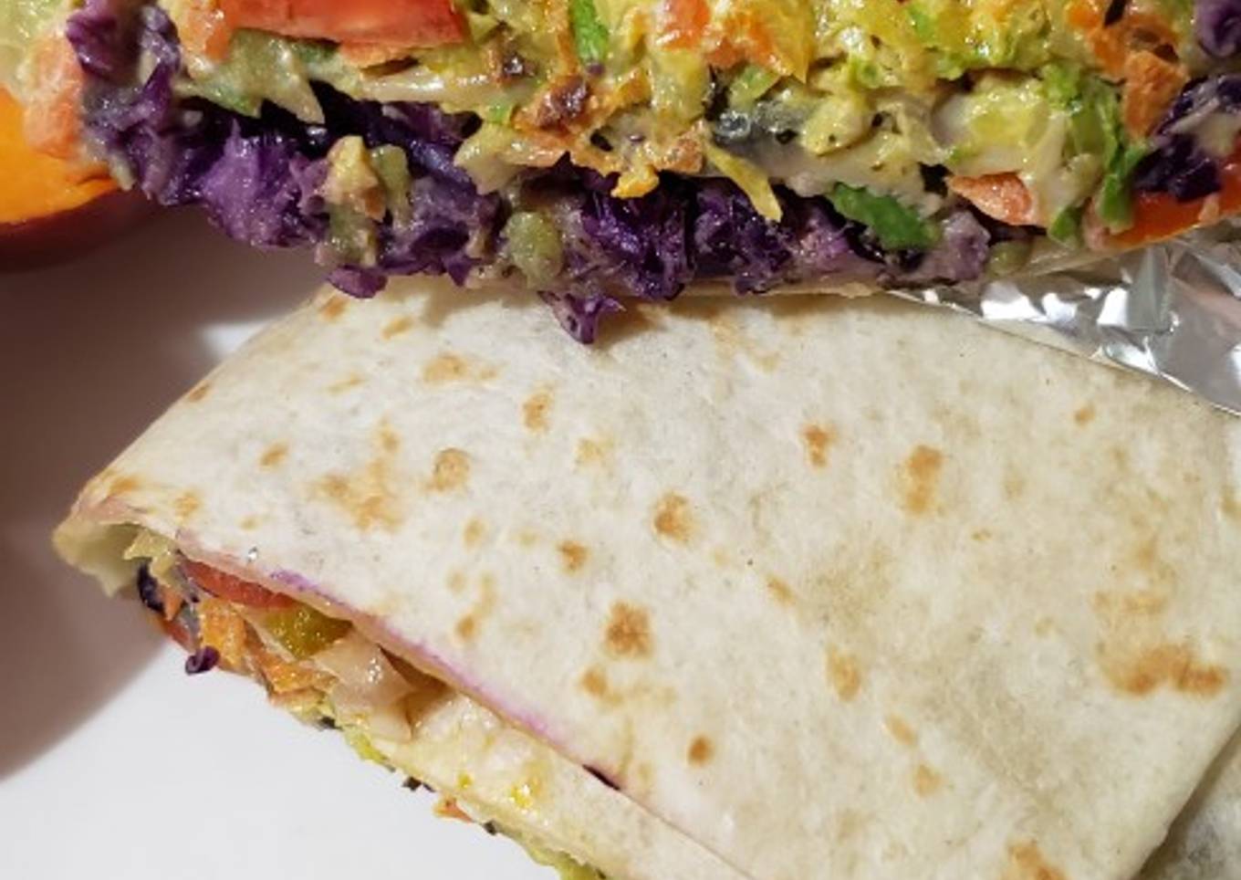 - Ensuite en prend notre tortilla on met guacamole, chou râpé, le mélange de légumes cuits et on ajoute les tranches de dinde fumée et Mozzarella râpée avec un peu de cornichons.