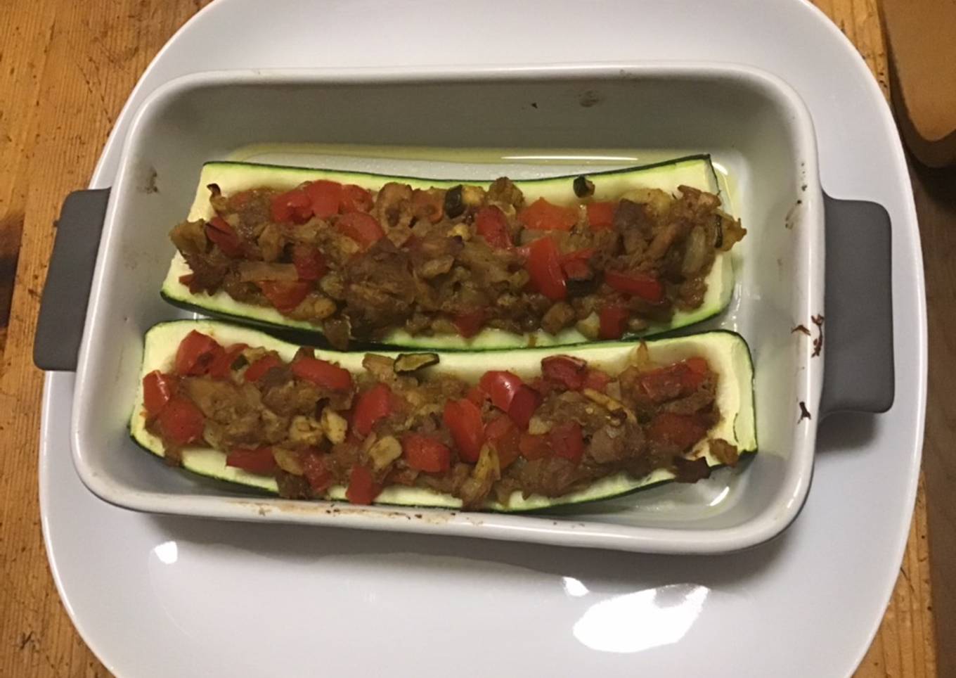 - Remplir les courgettes avec les légumes mijotés ajouter le bouillon dans le fond des plats enfourner pour 20 minutes