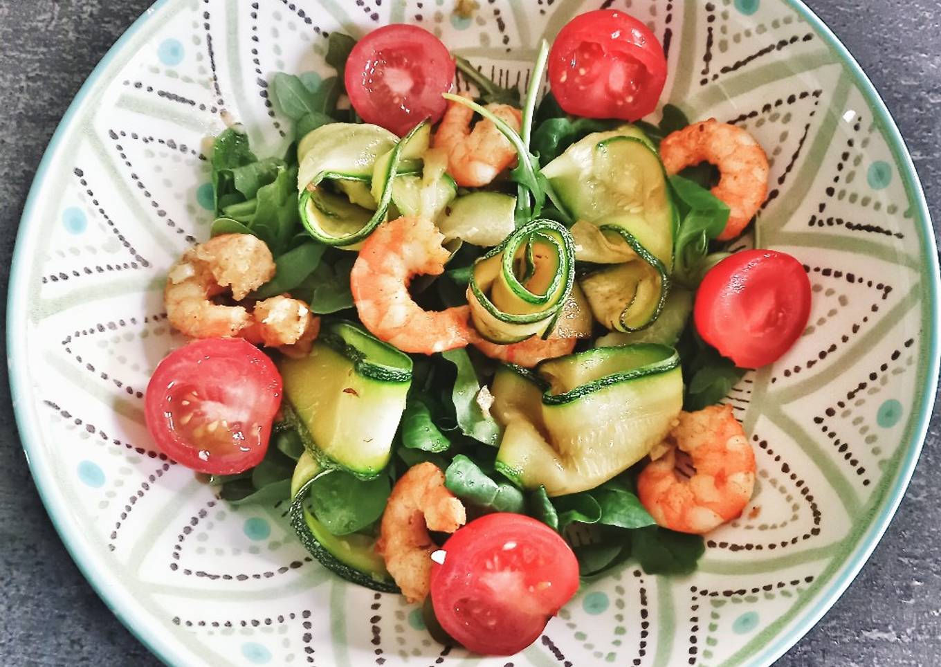 - Ensuite disposez les lamelles de courgette et les crevettes.