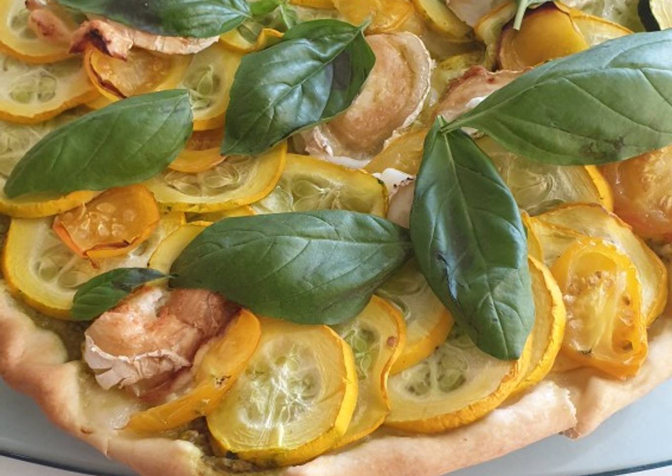 - Étaler la pâte brisée (maison ou toute faite !), tapisser le fond de pesto et disposer les courgettes et tomates, ainsi que des morceaux de chèvre.